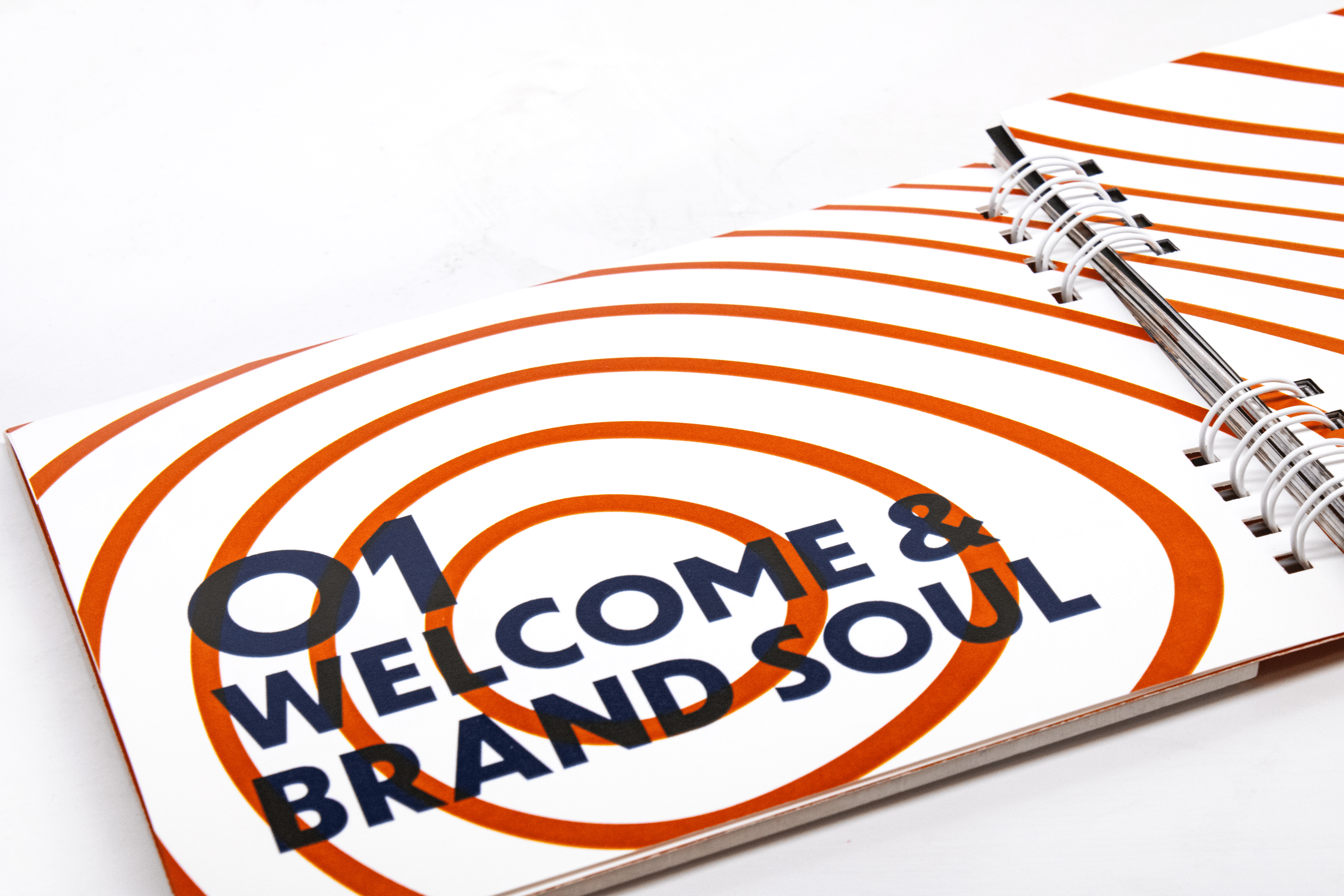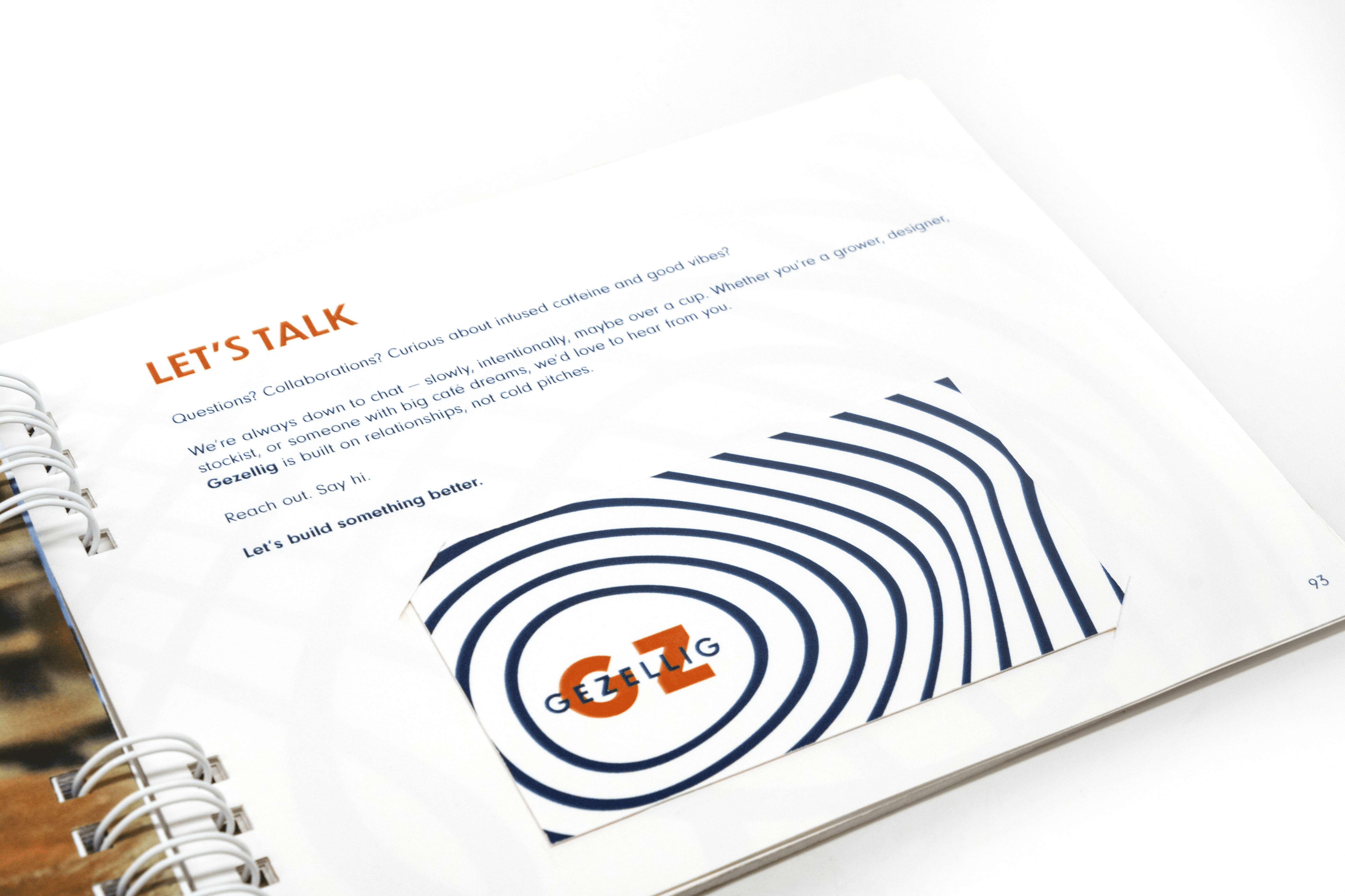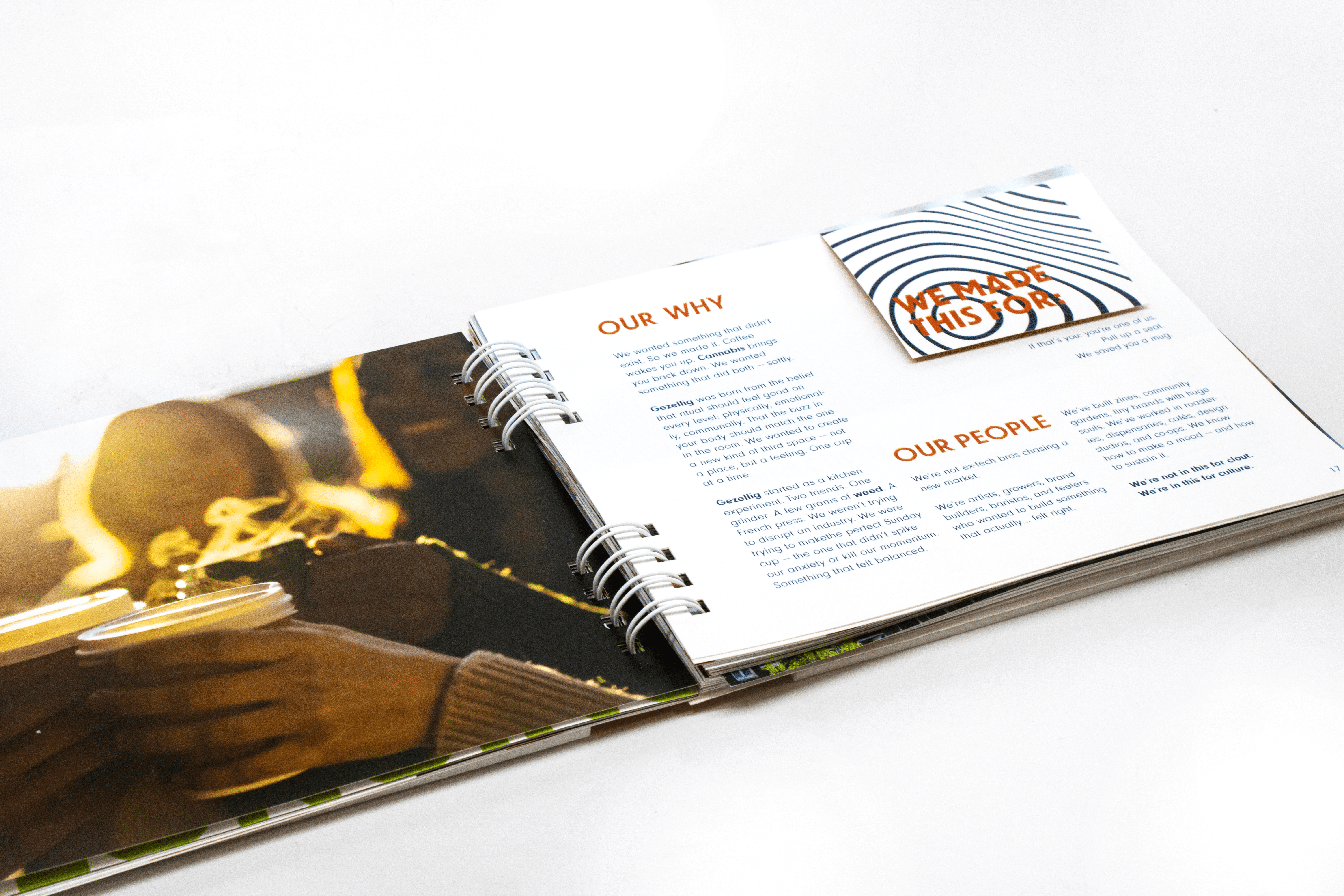 The lookbook features a unique acrylic cut out cover to bring visual interest and tie-in the pattern used throughout the coffee bags and uses unique printing methods, such as mini-page highlights and fold-over sections to reveal text underneath.
