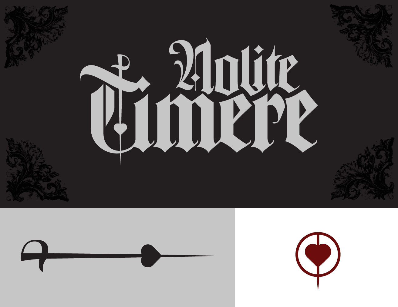 Nolite Timere, a latin phrase meaning "be not afraid," was inspired by secret martial art societies specifically for women seeking deadly self-defense practices to become more confident and independent. Print methods utilized were silver and crimson foil stamping.