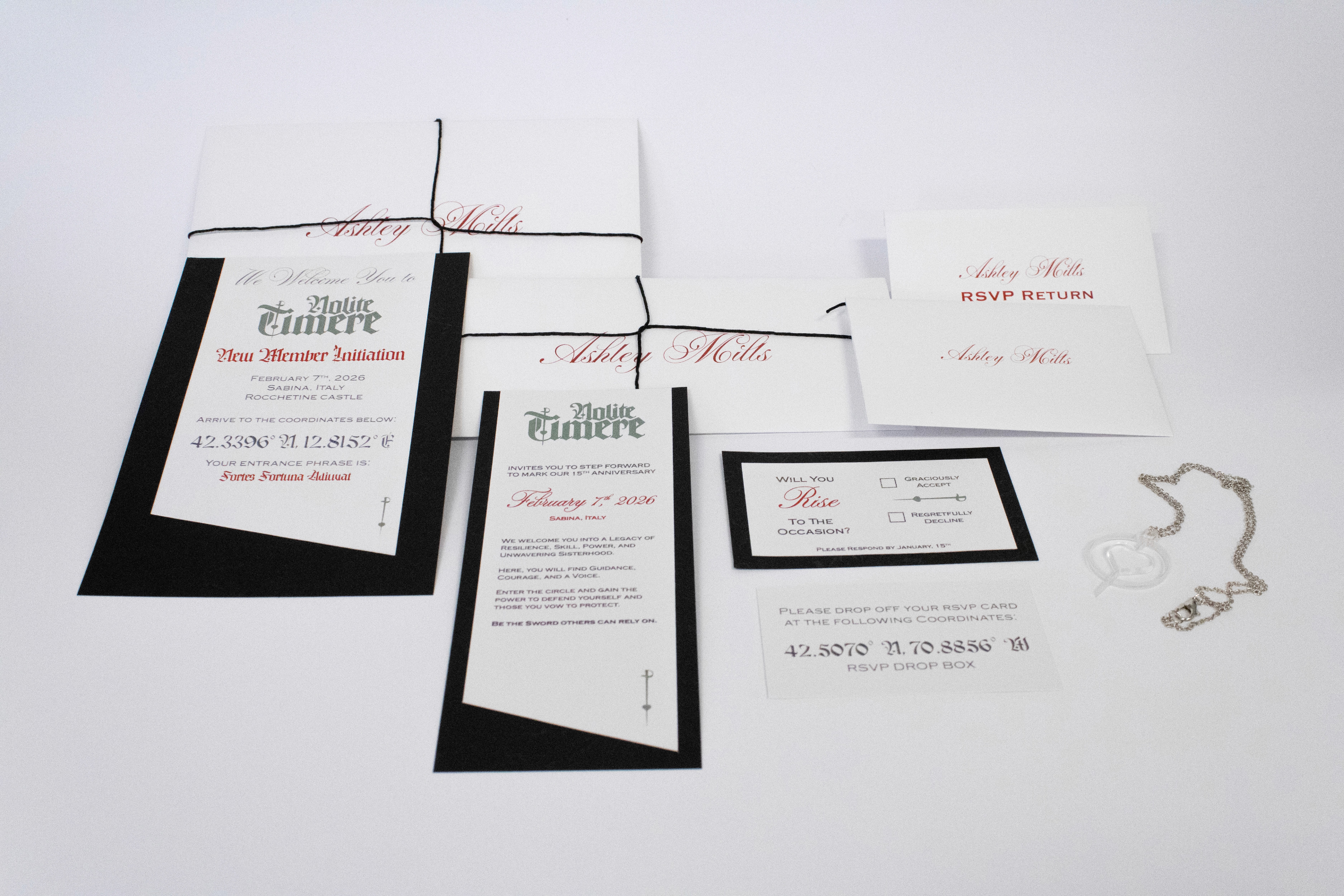 As part of my second Graphic Communications course, we were tasked with creating an invitation set (Save the Date, RSVP, Invitation, envelopes, and a promotional item) for an exclusive branded secret society.