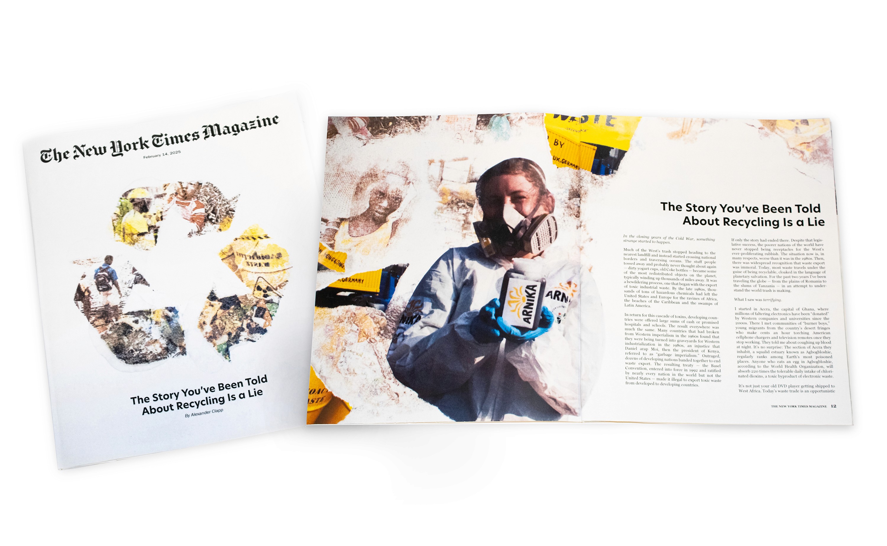 The article I chose to represent for this project is "The Story You've Been Told About Recycling Is a Lie," which discusses the way Western countries are essentially dumping their trash, even recycled, in countries in the East. I used an acetone transfer of printed photos of people affected by toxic waste and garbage in their countries to create a faded, worn-away effect, which represents how they are not represented well in the media.